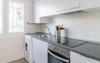La cocina tiene todos los electrodomésticos: lavadora, horno, nevera, microondas, vitrocerámica, cafetera, tostadora….